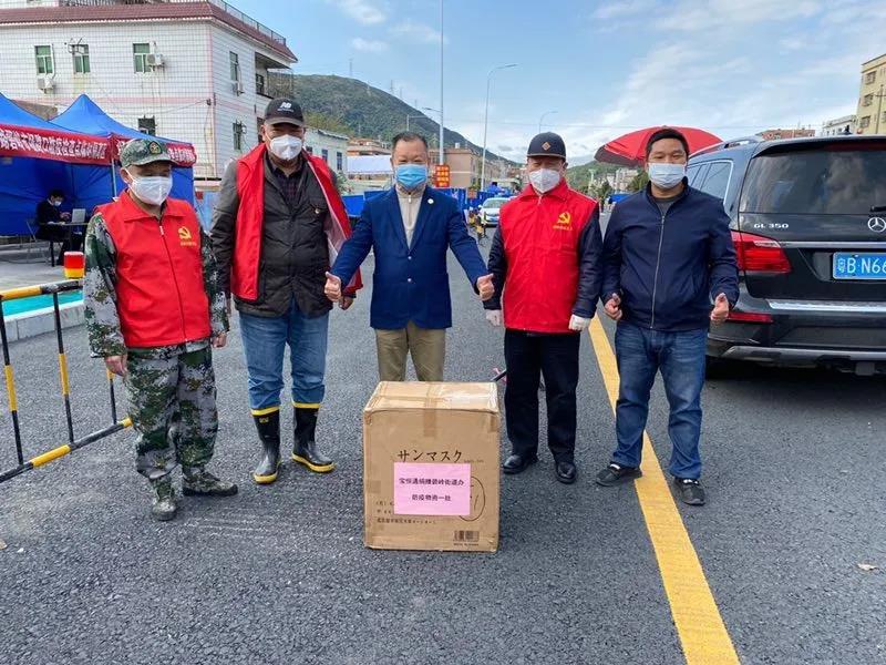 2月16日,深圳坪山金碧路碧岭社区防控检疫点,宝恒通集团向一线值勤的工作人员捐赠了一批从海外筹集的防疫物资。