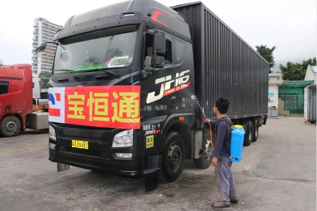 上午8:00,宝恒通营运中心工作人员首先按照公司车队防疫管控流程,对承运货车和两位司机进行检查,同时向司机们反复强调做好各项防疫措施和托运派送要求,确保人、车、货安全。随后工作人员对车头、车厢、车胎、驾驶室等进行全车消毒,对司机们进行体温测量登记,并发放公司特备的口罩、消毒液、防护手套、护目镜、防护服等防疫物品,以及矿泉水、方便面、面包等食品。