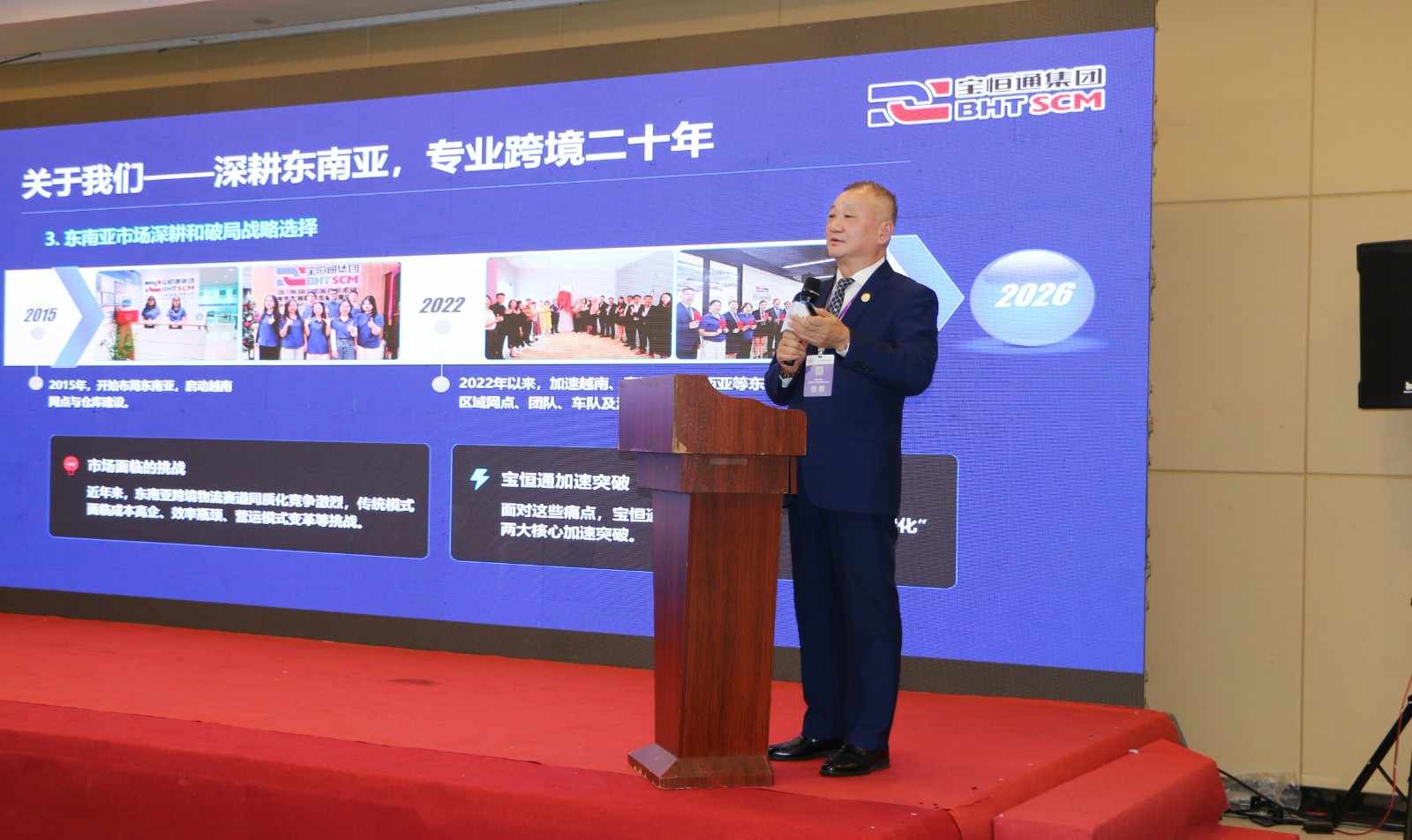 宝恒通集团董事长肖德军受邀出席活动,并在下午举行的大湾区“一带一路”陆路通道创新论坛上,他以“打造东南亚跨境陆运低碳智能化产品”为题,结合宝恒通深耕东南亚等跨境物流二十年的实践,分享了宝恒通在低碳化、数智化领域的创新布局与具体举措。