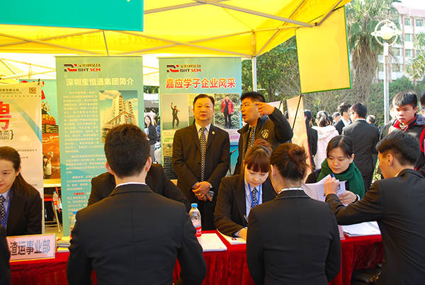 近日,由梅州市嘉应学院举办的“2015届校园供需见面会”在梅州嘉应学院世纪广场盛大举行,深圳宝恒通集团作为受邀企业参加,集团领导极度重视,并由总经理肖德军先生亲自带队率领集团各事业部分管行政人事的经理、主管前往参加。活动前一天,我司在校方邀请下在嘉应学院金利来多媒体教室举办了一场面向广大应届毕业生的“宝恒通集团职场讲座”,得到了校领导的一致赞赏和同学们的喜爱。