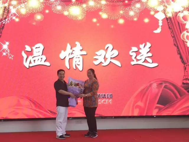 集团董事长办公室主任兼管理中心人资行政部部长李信锋为龚秀珍女士颁发《光荣退休证》,并为其献上鲜花。