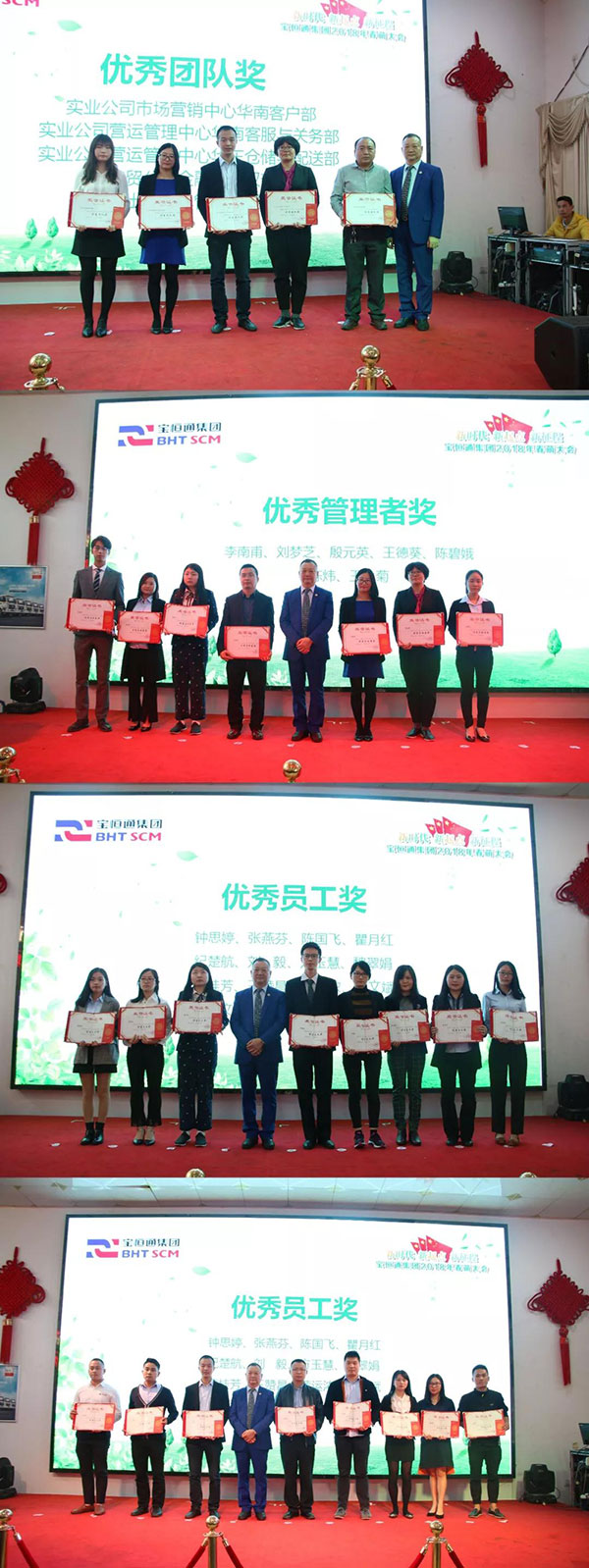 回顾集团走过的不平凡的2017年,集团各主营业务板块涌现出一大批德才兼备、敬业爱岗、表现突出的优秀团队和个人,他们成为员工的表率。为了感谢他们在2017年度作出的贡献,集团特地设置了优秀团队、优秀管理者以及优秀员工等奖项,并在大会上进行隆重表彰,为他们颁发了荣誉证书和奖金,对他们一年来的辛勤付出进行嘉奖,同时号召全体员工以他们为榜样,今后取得更大的进步。