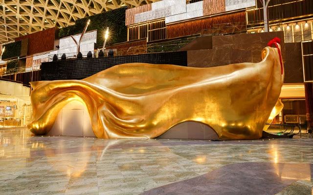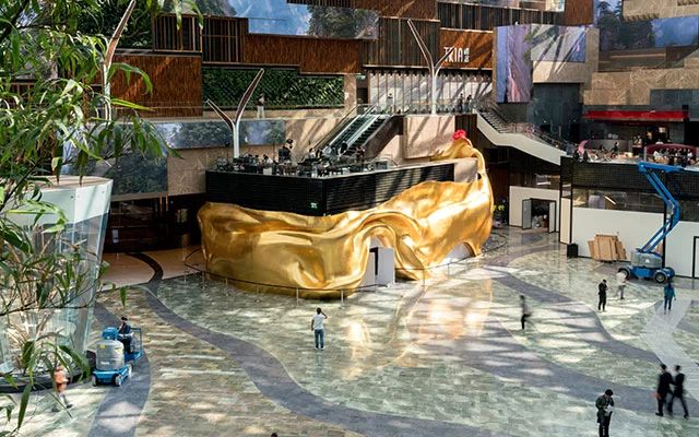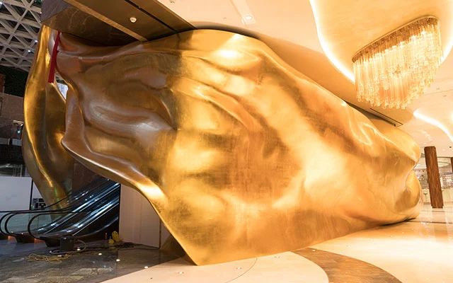 作品以风力学实验、3D打印等高新科技诠释了新时代的东方宇宙观。虚物质“风”的能量律动,饱含着“气”的生命呼吸,传递出天地人间的和合生气与温婉磅礴的光明能量,更打造出“一带一路步步高,一团和气幸运门”的金碧辉煌胜景。