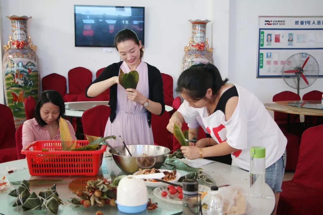 在欧曼餐厅大厨精心准备的包粽子食材,大家准备开始包粽子咯,现场当中有包粽子的高手,也有初学包粽子的徒弟,大家齐心合力,其乐融融。